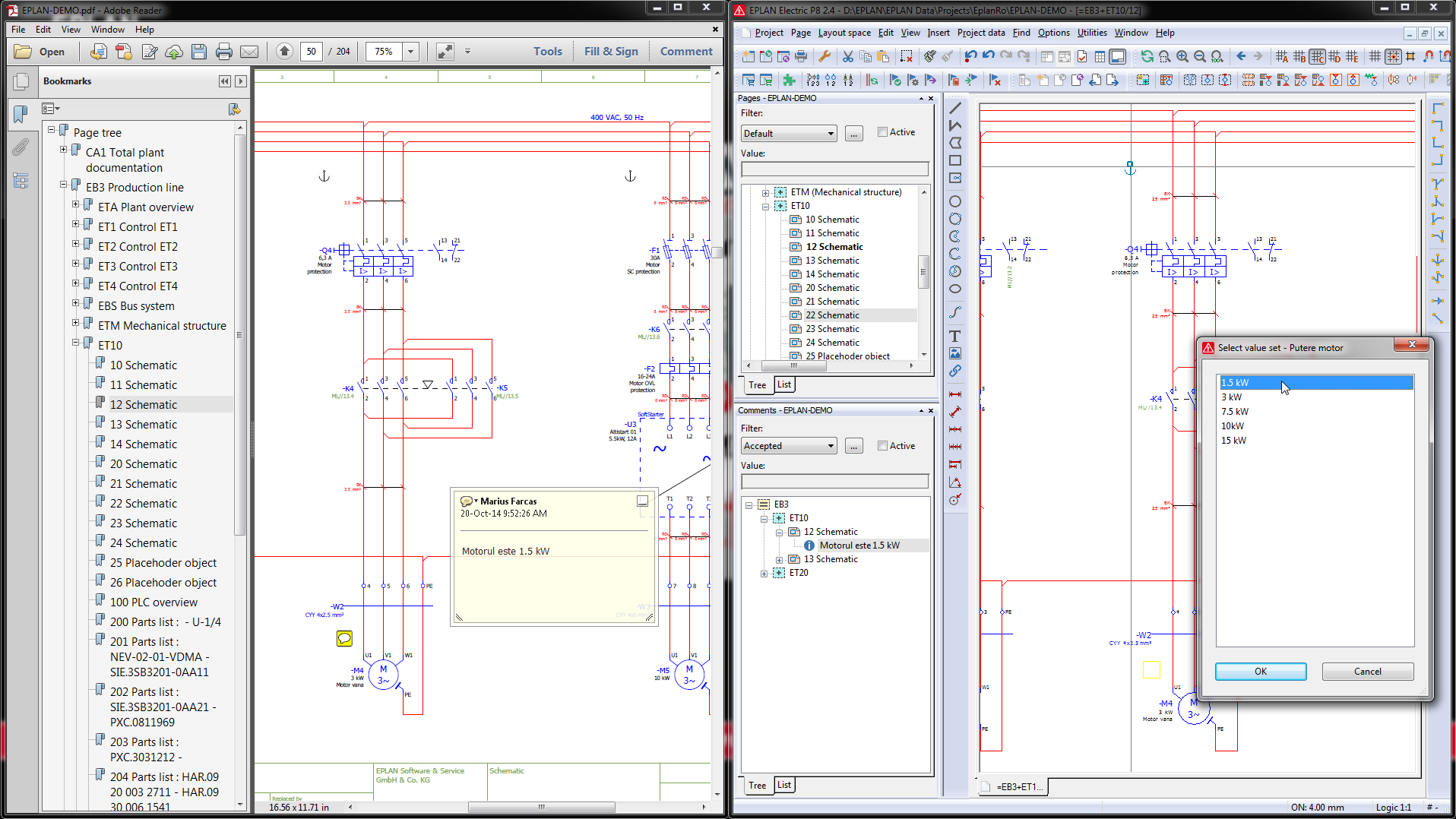 EPLAN-ul este un sistem de inginerie informatica ce ofera nenumarate functii utile in realizarea rapida si corecta a documentatiilor electrice. De multe ori insa, o combinatie a acestor functii va aduce un beneficiu suplimentar, in special in viteza de generare a schemelor finale. Atunci cand vine vorba de obtinerea unei aprobari pentru o astfel de documentatie cel mai comun si comod format de schimb de informatii este PDF-ul. Documentele PDF inteligente generate de EPLAN contin multe informatii, pe langa paginile efective din proiectul original: aveti posibilitatea de a naviga rapid folosind trimiterile si in fisierul PDF, atat intre pagini cat si intre componentele aceluiasi aparat (practic, toate trimiterile din EPLAN functioneaza 100% si in PDF!); sub forma de "semne de carte" (bookmarks) veti gasi, de asemenea, familiarul navigator de pagini si navigator de aparate care redau fidel structurile originale din proiectul EPLAN precum si paginile, respectiv aparatele cu toate componentele lor; chiar si desenele 3D ale tablourilor vor fi prezente in fisierele PDF exportate din EPLAN, desigur, daca acestea sunt prezente in proiectul original. Un beneficiu suplimentar adus de folosirea PDF-ulurilor inteligente este faptul ca in acelasi director in care se creeaza fisierul PDF, EPLAN-ul copiaza automat si toate documentele sau imaginile atasate schemelor electrice - obtineti astfel foarte rapid o documentatie completa a proiectului pe care o puteti arhiva usor pentru a fi trimisa spre aprobare. Functionalitatea PDF-ului nu se opreste aici! Puteti cere clientilor sau sefilor de departament care verifica proiectele sa isi completeze observatiile direct in fisierul exportat sub forma de note, texte sau chiar desene mai mult sau mai putin complexe. Toate acestea pot fi preluate ulterior in proiectul original EPLAN folosind functia de import de comentarii din PDF, pot fi localizate usor pe scheme folosind un navigator specializat si pot fi gestionate in EPLAN chiar prin atribuirea unor statusuri ce permit filtrarea usoara a observatiilor ce nu sunt implementate. Puteti combina aceasta functionalitate de preluare a comentariilor si cu alte unelte puse la dispozitie de platforma EPLAN. Cea mai indicata metoda de realizarea schemelor de forta, de exemplu, este folosirea macrourilor cu seturi de valori. Acestea permit configurarea rapida a unui circuit de forta (incluzand aici curentul aparatului de protectie, sectiunile conductoarelor si cablurilor, clemele, contactorul sau orice alt aparat din circuit) in functie de puterea consumatorului, pe baza unui tabel cu seturi de valori predefinite de utilizator. Daca unul din comentariile primite de la client presupune schimbarea puterii unui astfel de circuit, nu este necesara re-desenarea sau modificarea manuala a proprietatilor tuturor componentelor din circuit ci se face, pur si simplu, o re-alegere a setului de valori care face automat toate aceste modificari in cateva secunde! Pentru mai multe detalii, va invitam sa ne contactati!